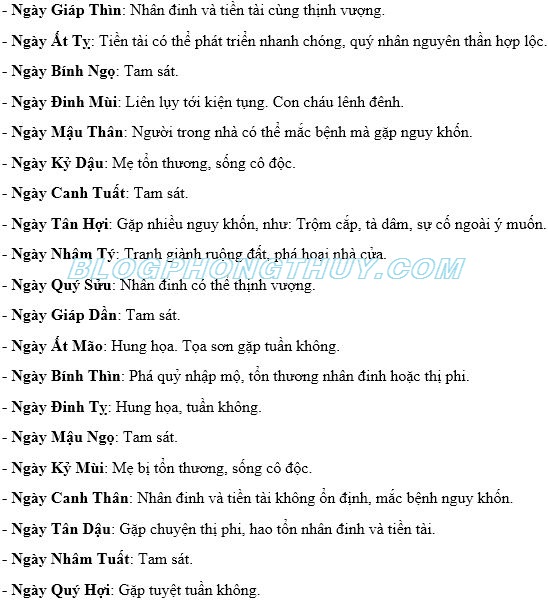 Sau đây là ý nghĩa tốt, xấu, của 60 ngày, từ ngày Giáp Tý đến ngày Quý Hợi theo bí quyết của phong thủy học, trong việc tiến hành xây dựng, tu tạo nhà cửa, công ty, cửa hàng, đình chùa, miếu phủ, nhà thờ gia tộc v.v…thuộc SƠN QUÝ – HƯỚNG ĐINH: