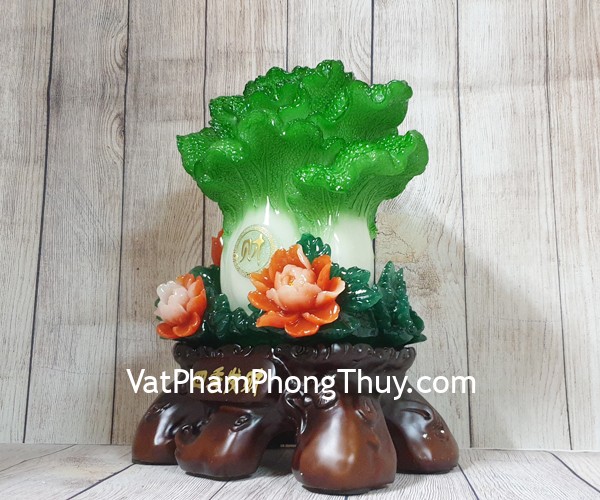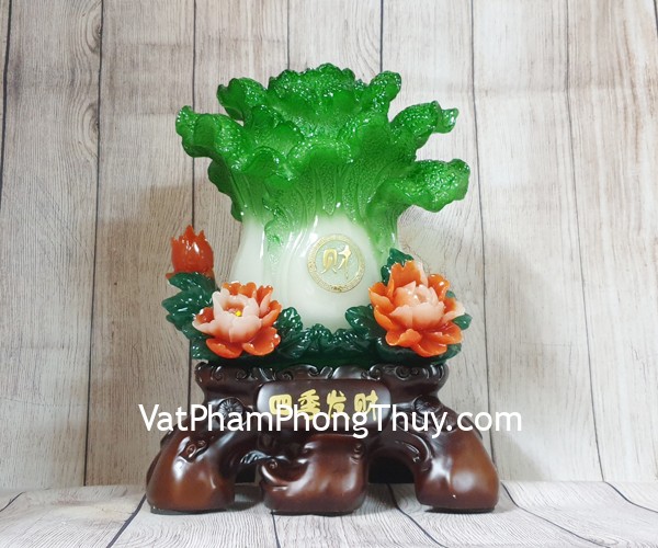 + Chất liệu và hoàn thiện: Bắp cải xanh đứng lớn trên bụi mẫu đơn đỏ đế gỗ, bột đá màu (tại Việt Nam)