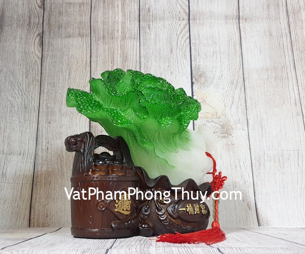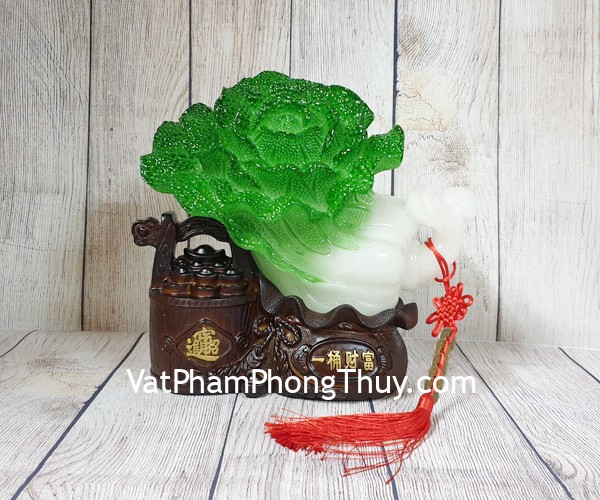 + Ý nghĩa: Chiêu Tài Tấn Bảo/ Một Thùng Tài Phú – theo cách đọc chữ Hán, bắp cải được đọc là “bạch thái”, dịch ra sẽ hài âm với từ “bách tài”, có nghĩa là tài lộc và may mắn rất dồi dào, kết hợp với thùng kim nguyên bảo, vật phẩm phong thủy trưng bày trong nhà, cửa hàng kinh doanh để gia chủ cầu được may mắn, tài lộc như ý muốn.