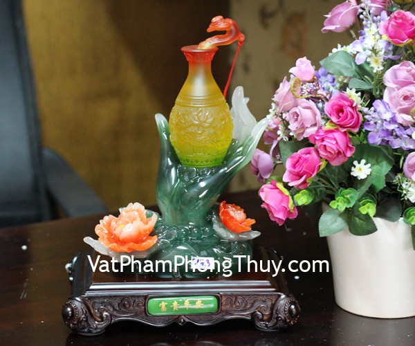 + Chất liệu và hoàn thiện: Bình tài lộc trên tay phật có gậy như ý, đế gỗ, bột đá màu cao cấp (tại Việt Nam).