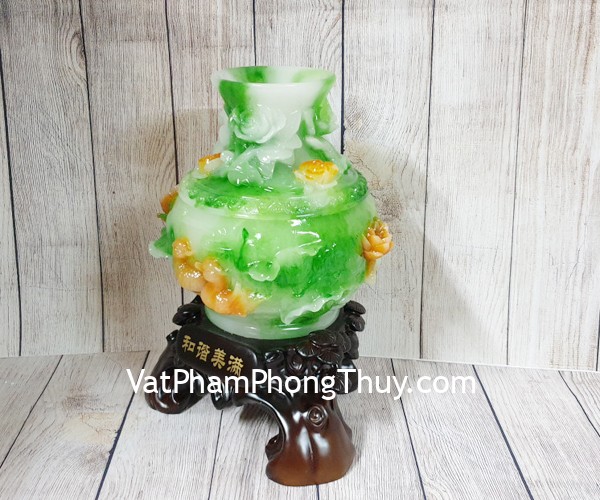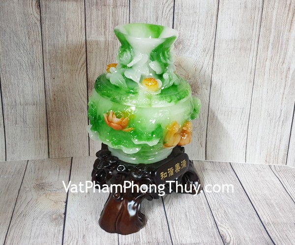 + Chất liệu và hoàn thiện: Bình tài lộc xanh ngọc trắng chạm uyên ương trên đế gỗ nghệ thuật, bột đá màu cao cấp (tại Việt Nam).