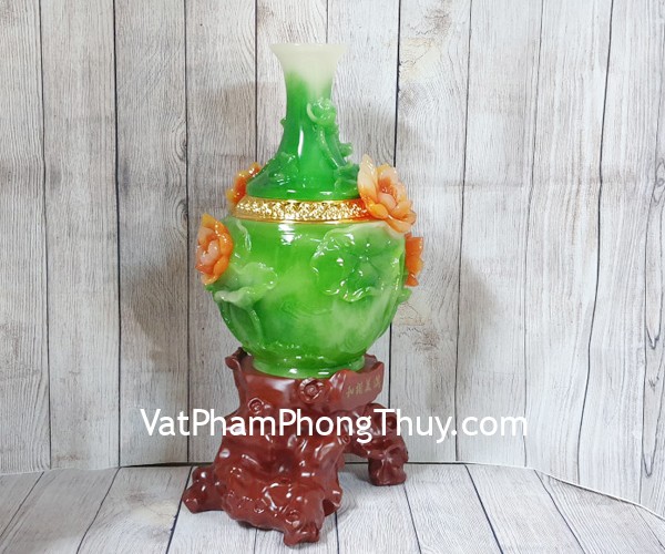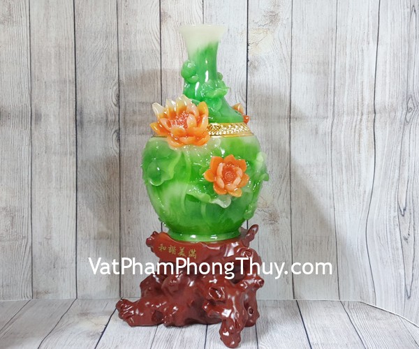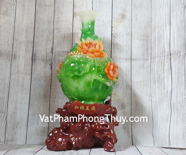 + Chất liệu và hoàn thiện: Bình tài lộc xanh viền vàng hoa sen trên đế gỗ nghệ thuật, bột đá màu cao cấp (tại Việt Nam).