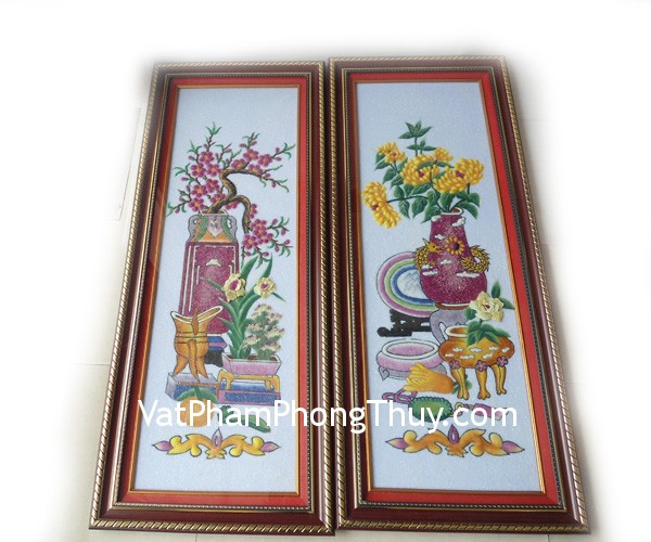 + Chất liệu và hoàn thiện : Tranh tứ quý bình cổ (đào-cúc-sen-hải đường) – Tranh đá quý Lục Yên