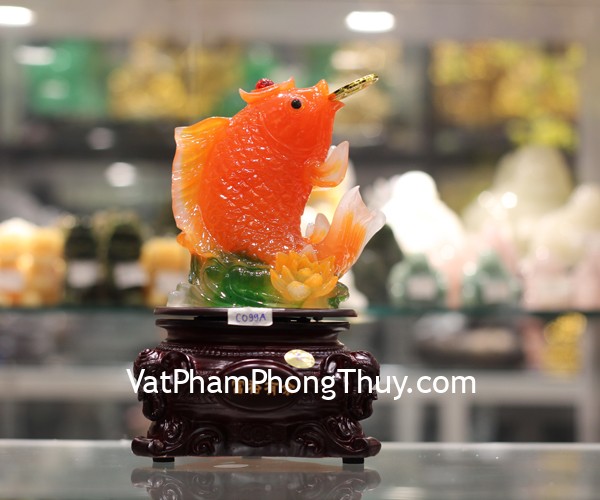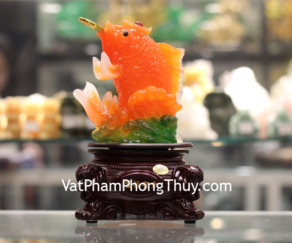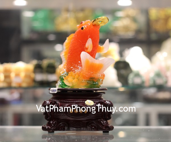 + Chất liệu và hoàn thiện: Tượng cá chép cam nhả tiền, trên đế gỗ xoay, bột đá màu cao cấp (tại Việt Nam).