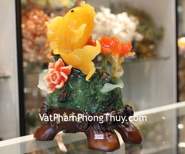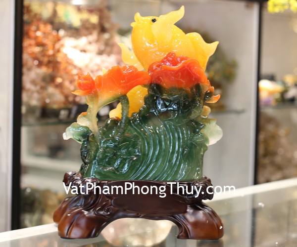 + Chất liệu và hoàn thiện: Tượng cá chép vàng trên hoa sen, đế gỗ, bột đá màu cao cấp (tại Việt Nam).