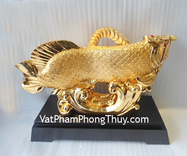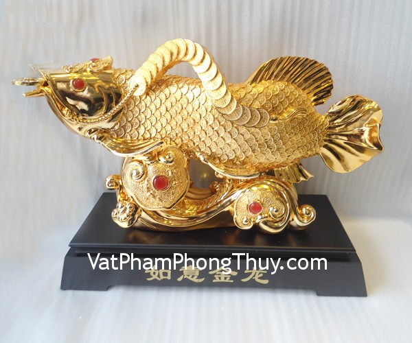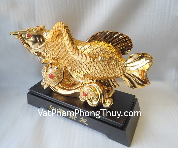 + Chất liệu và hoàn thiện: Tượng cá kim long như ý lớn, bột đá mạ vàng trên đế gỗ (tại Việt Nam).