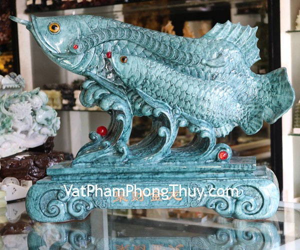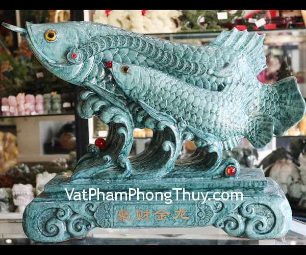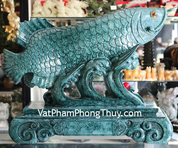 + Chất liệu và hoàn thiện: Tượng cá kim long mẫu tử vân xanh ngọc, đế bột đá xanh, hàng cao cấp (tại Việt Nam).