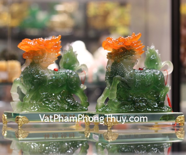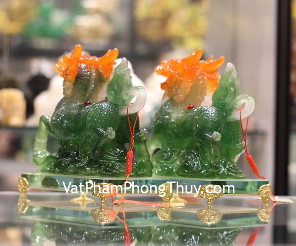 + Chất liệu và hoàn thiện: Cặp kỳ lân ngọc xanh, mào đỏ, trên đế thủy tinh, hàng bột đá cao cấp (tại Việt Nam)