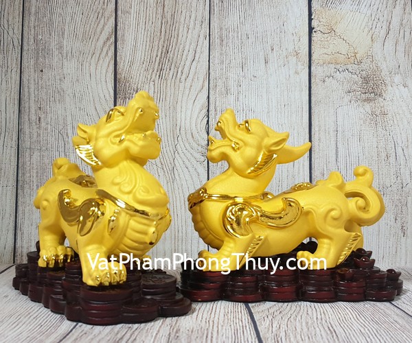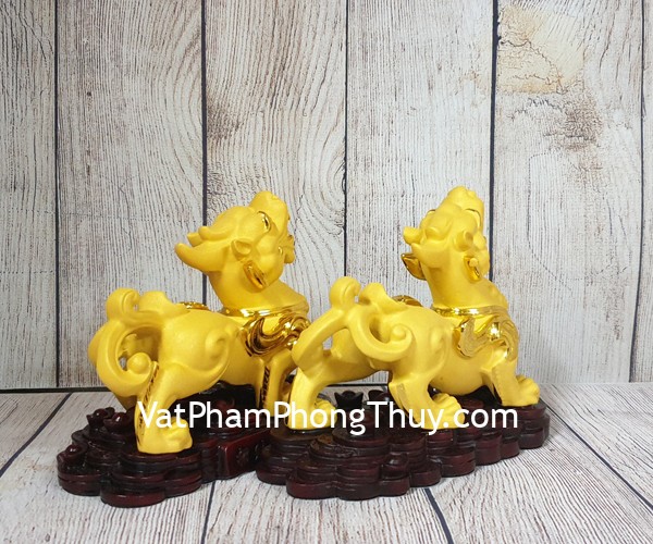+ Chất liệu và hoàn thiện: Cặp tỳ hưu vàng kim sa trên đống tiền gỗ, bột đá mạ vàng sa kim (tại Việt Nam).