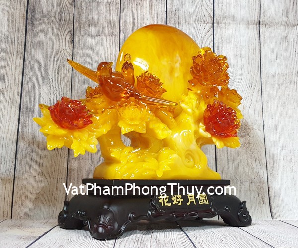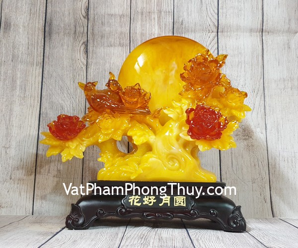 + Chất liệu và hoàn thiện: Cây hoa mẫu đơn vàng ngọc, hoa đỏ cam lưu ly bên trăng vàng và uyên ương trên đế gỗ, hàng bột đá màu cao cấp (tại Việt Nam).