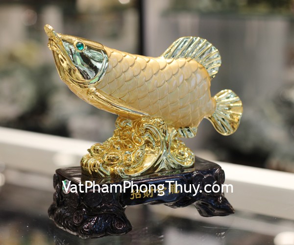 + Chất liệu và hoàn thiện: Tượng cá kim long bột đá mạ vàng cao cấp, trên đế gỗ (tại Việt Nam).