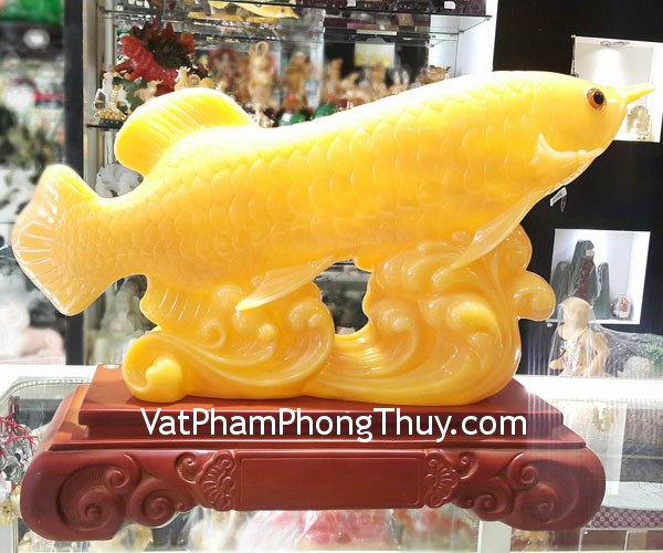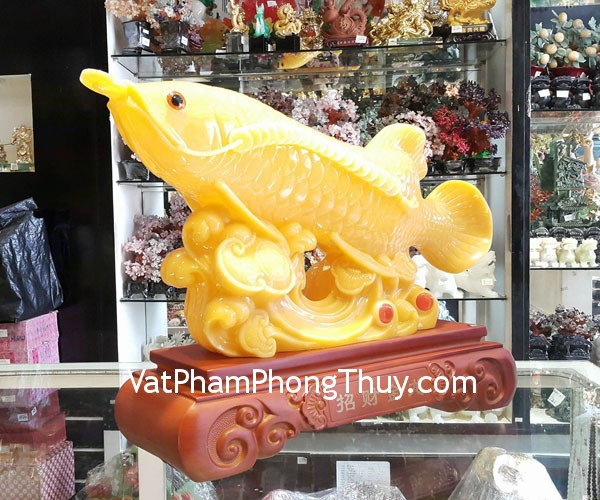 + Chất liệu và hoàn thiện: Tượng cá kim long bột đá màu cao cấp trên đế gỗ (tại Việt Nam).