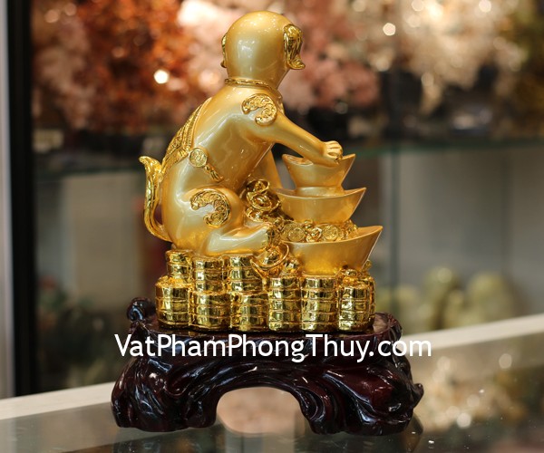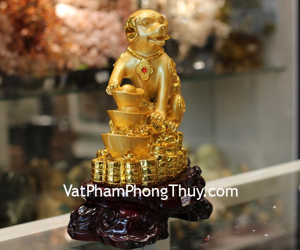 + Chất liệu và hoàn thiện: Tượng chó vàng (Tuất) bên đỉnh kim nguyên bảo, có đế gỗ, bột đá mạ vàng cao cấp (tại Việt Nam).