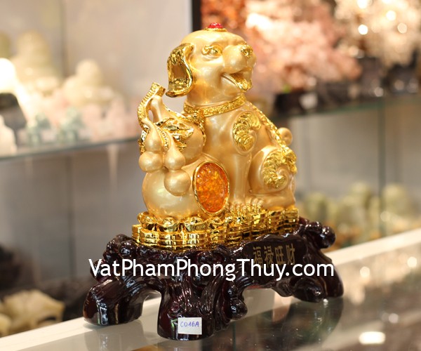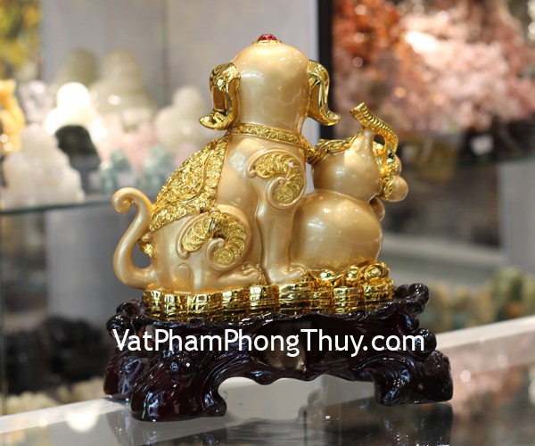 + Chất liệu và hoàn thiện: Tượng chó (Tuất) vàng bên hồ lô bình an, có đế gỗ, bột đá mạ vàng cao cấp (tại Việt Nam).