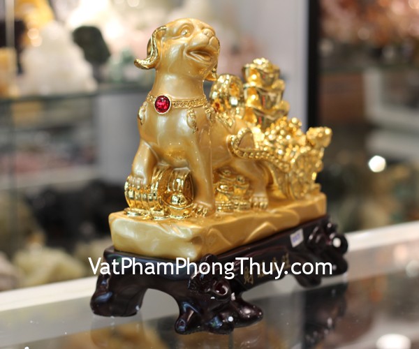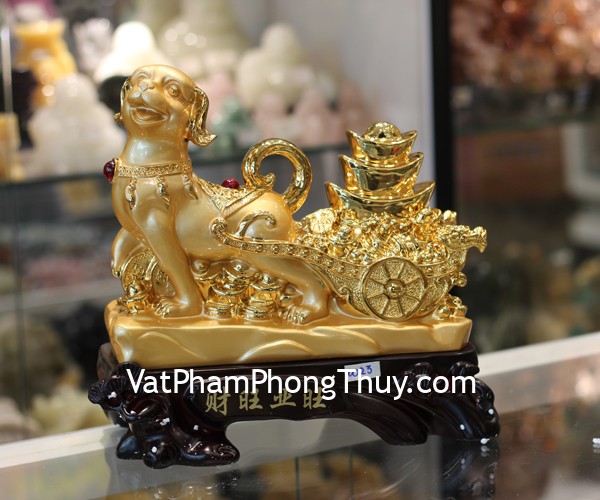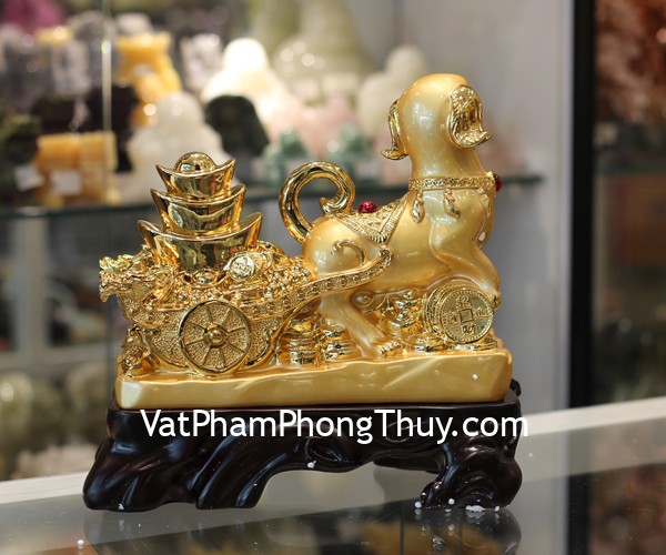 + Chất liệu và hoàn thiện: Tượng chó vàng (Tuất) kéo xe vàng tài vượng, có đế gỗ, bột đá mạ vàng cao cấp (tại Việt Nam).