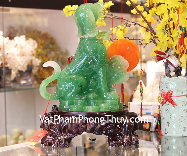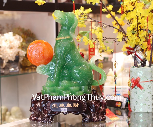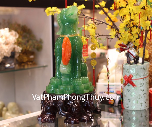 + Chất liệu và hoàn thiện: Tượng chó xanh (Tuất) ôm trăng hồng, có đế gỗ, bột đá màu cao cấp (tại Việt Nam).