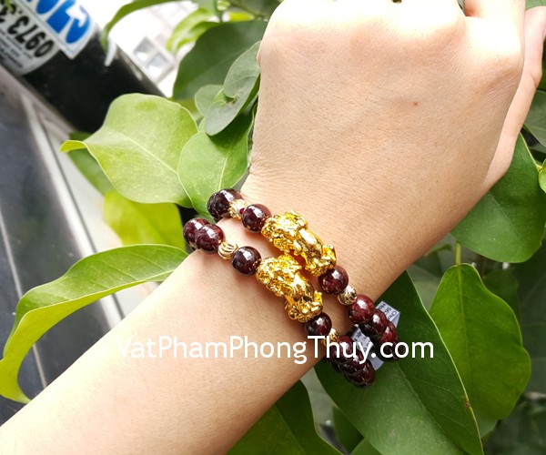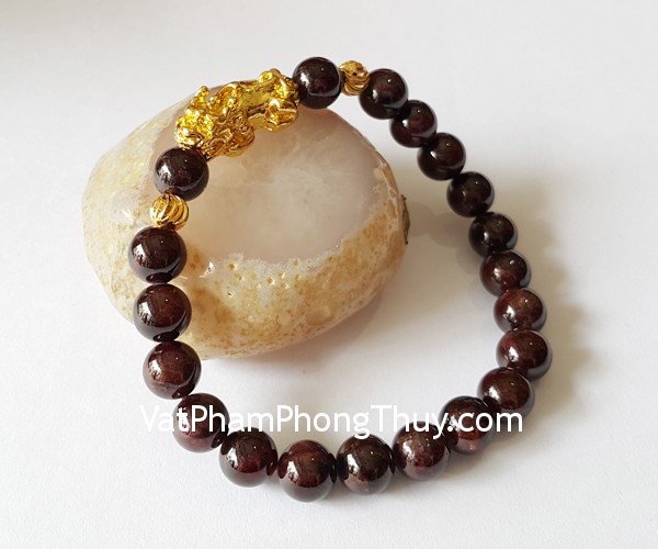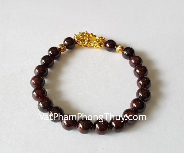 + Chất liệu và hoàn thiện: Chuỗi đeo tay bằng chất liệu đá hạt lựu (garnet), phụ kiện tỳ hưu hợp kim crôm (tại Việt Nam).