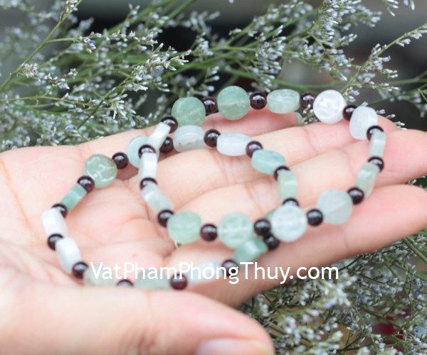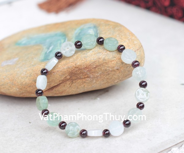 + Chất liệu và hoàn thiện: Chuỗi đồng tiền ngọc phỉ thúy may mắn kết hợp đá hạt lựu tròn (tại Việt Nam).