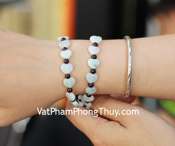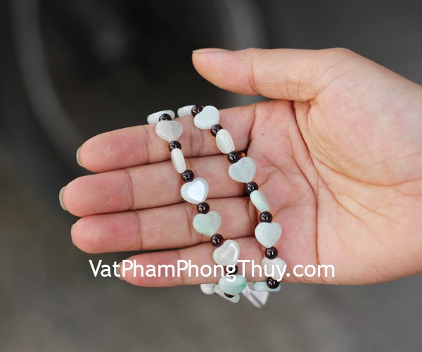 + Chất liệu và hoàn thiện: Chuỗi phỉ thúy trái tim xen hạt lựu (tại Việt Nam).