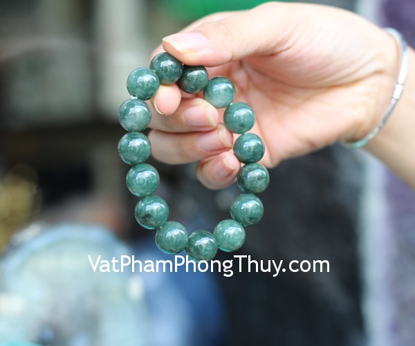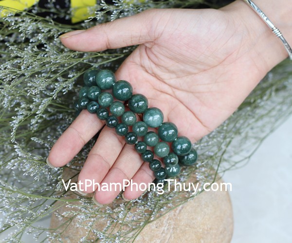 + Chất liệu và hoàn thiện: Chuỗi đeo tay ngọc Phỉ Thúy vân xanh đậm cỡ lớn (tại Việt Nam).