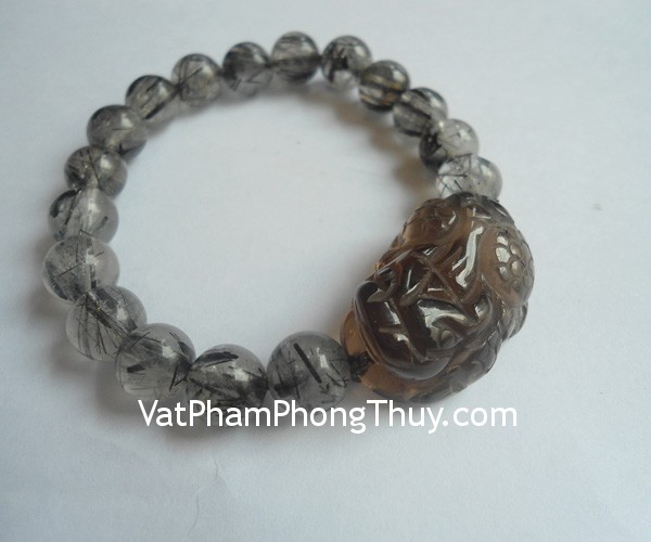 + Chất liệu và hoàn thiện: Chuỗi tỳ hưu mã não khói + thạch anh tóc tiên đen (tại Việt Nam).