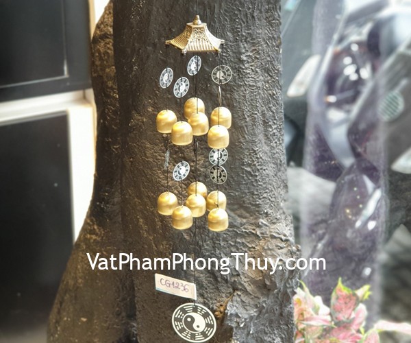 + Chất liệu và hoàn thiện: Chuông gió đồng dạng ống chum kết hợp mái chùa và xu bát quái (tại Việt Nam).