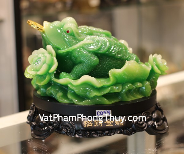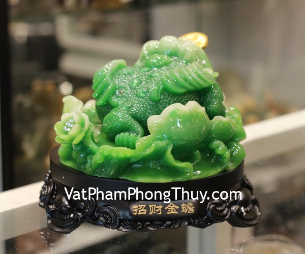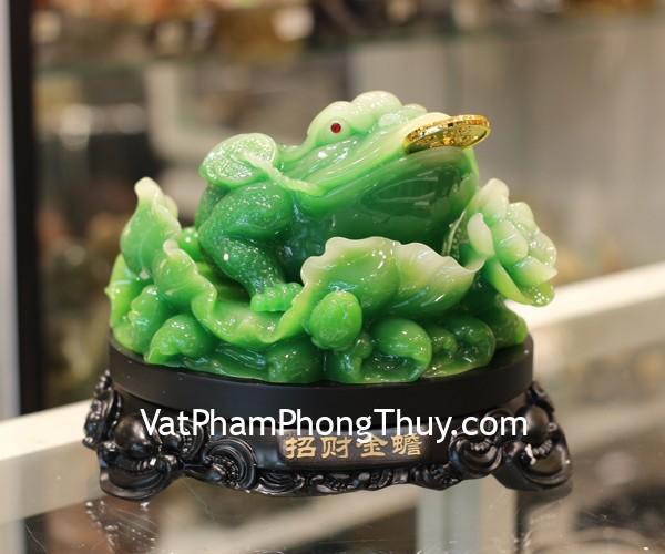 + Chất liệu và hoàn thiện: Thiềm thừ (cóc ba chân) xanh trên lá sen, có đế gỗ xoay, bột đá màu cao cấp (tại Việt Nam).