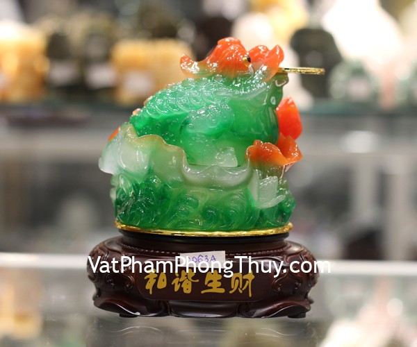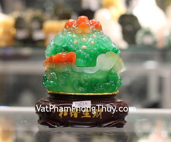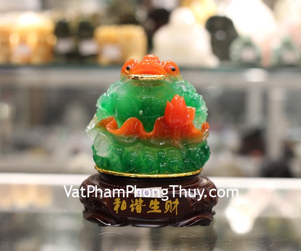 + Chất liệu và hoàn thiện: Thiềm thừ (cóc ba chân) xanh mào đỏ trên lá sen, có đế gỗ xoay, bột đá màu cao cấp (tại Việt Nam).