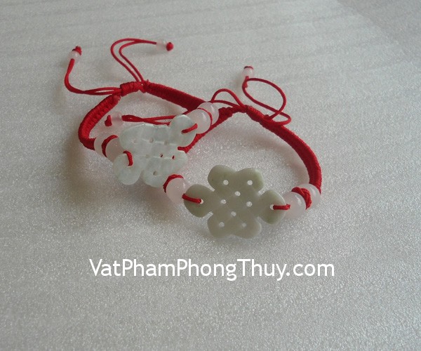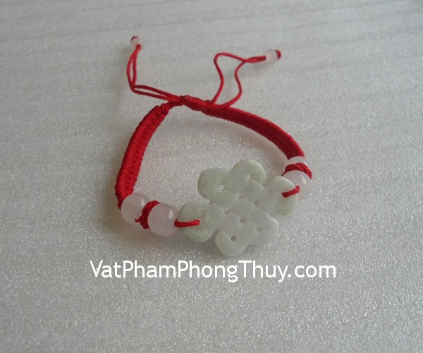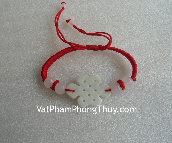 + Chất liệu và hoàn thiện: Vòng tay dây rút dây đỏ, biểu tượng may mắn (nút thắt vô tận) và 4 hạt trắng Myanmar (Miến Điện, Myanmar).