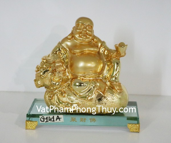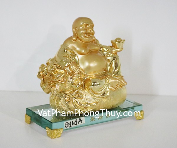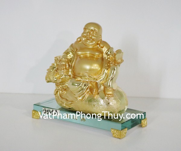 + Chất liệu và hoàn thiện: Phật di lạc vàng ngồi trên túi tiền, đế thủy tinh, hàng bột đá mạ vàng cao cấp (tại Việt Nam).