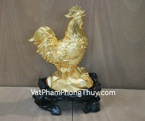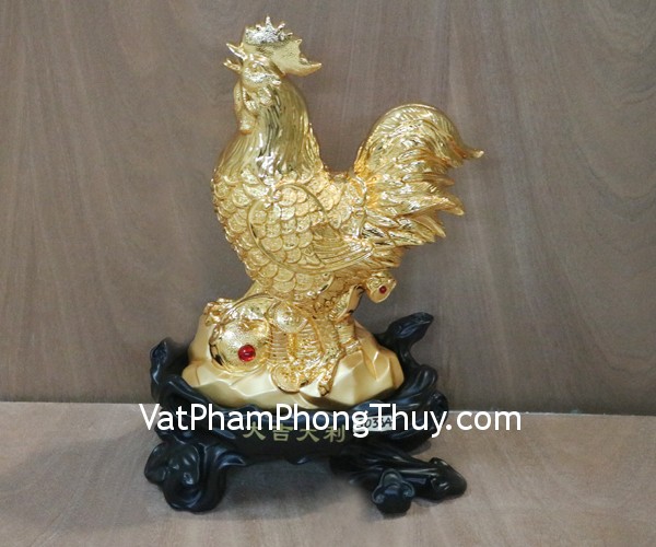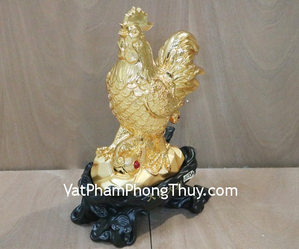 + Chất liệu và hoàn thiện: Tượng gà vàng lông dát đồng tiền vàng, đứng trên núi đá vàng cỡ nhỏ, hàng bột đá mạ vàng non cao cấp (tại Việt Nam)