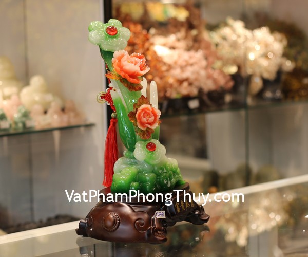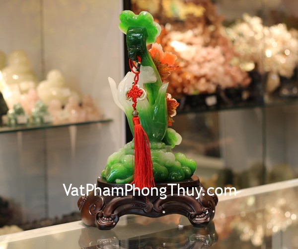 + Chất liệu và hoàn thiện: Gậy như ý lưu ly trên tay phật bình an, kèm hoa mẫu đơn phú quý, đế gỗ, hàng bột đá màu cao cấp (tại Việt Nam).