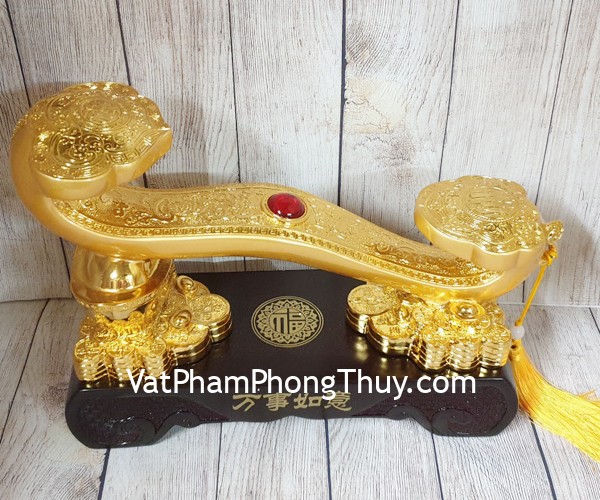 + Chất liệu và hoàn thiện: Gậy như ý vàng khủng gắn hồng châu trên kim nguyên bảo, hàng bột đá mạ vàng cao cấp (tại Việt Nam).