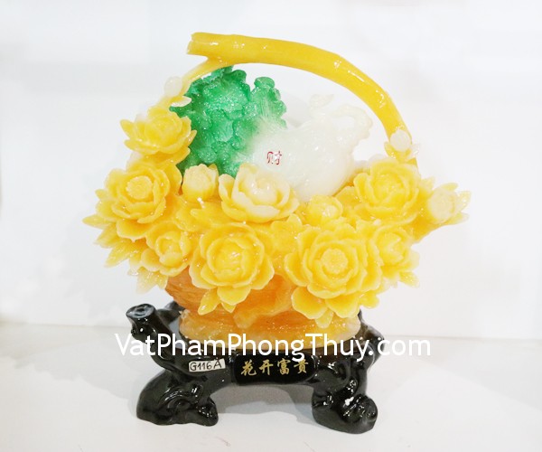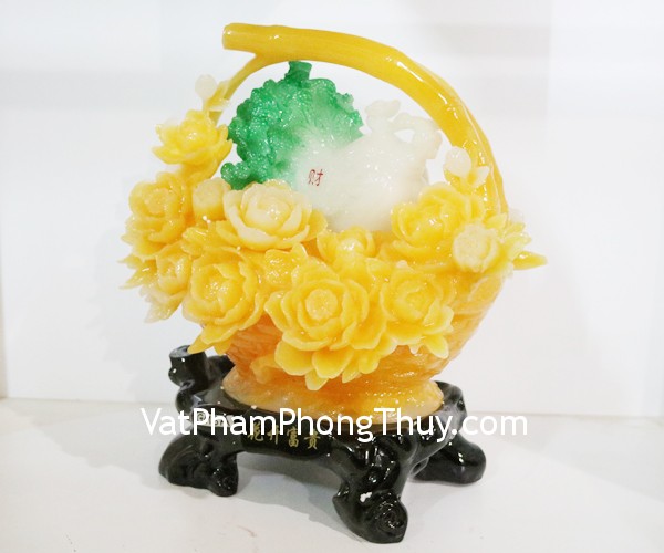+ Chất liệu và hoàn thiện: Tượng giỏ hoa mẫu đơn bên bắp cải tài lộc, có đế gỗ, hàng bột đá màu cao cấp (tại Việt Nam).