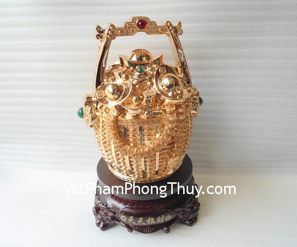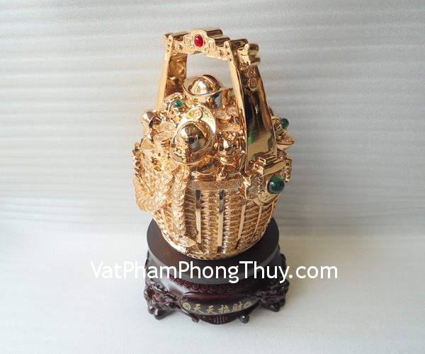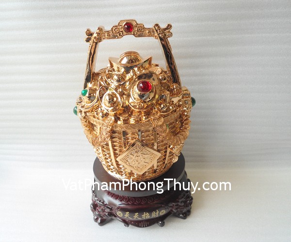 + Chất liệu và hoàn thiện: Tượng giỏ tiền vàng trên đế gỗ, bột đá mạ vàng (tại Việt Nam).