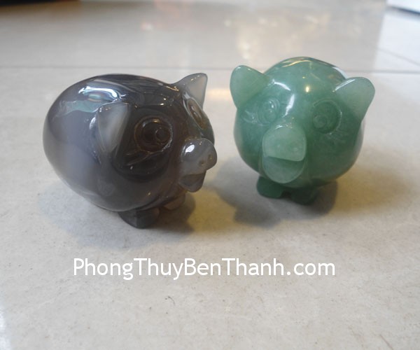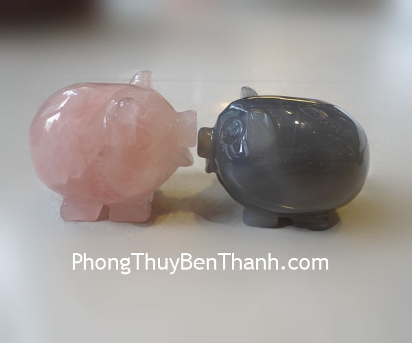 + Chất liệu và hoàn thiện: Heo đá thạch anh hồng, thạch anh xanh (đá ngọc Đông Linh), mã não xám khói (tại Việt Nam).