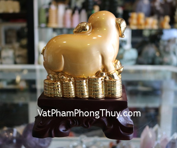 + Chất liệu và hoàn thiện: Tượng heo vàng trên đế gỗ có châu đỏ, hàng bột đá mạ vàng non (tại Việt Nam).