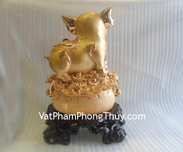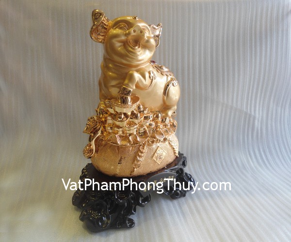 + Chất liệu và hoàn thiện: Tượng heo vàng phước cao tài vận trên đế gỗ lớn, bột đá mạ vàng non (tại Việt Nam).