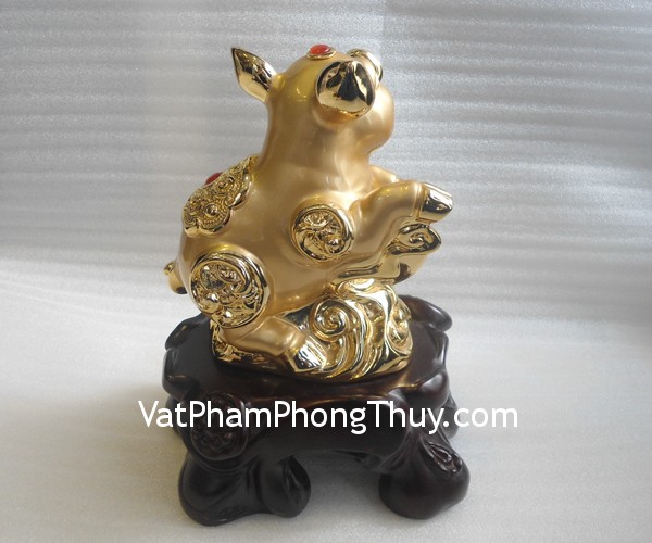 + Chất liệu và hoàn thiện: Tượng heo bằng bột đá mạ vàng non (tại Việt Nam).