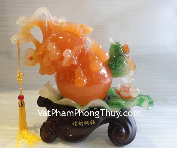 + Chất liệu và hoàn thiện : Hồ lô cam trên lá sen và thiềm thừ (cóc ba chân) bằng bột đá màu (tại Việt Nam).
