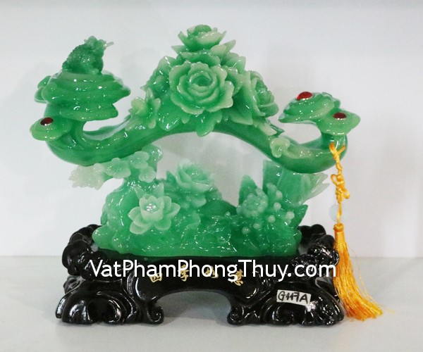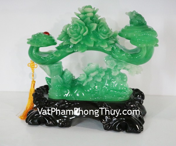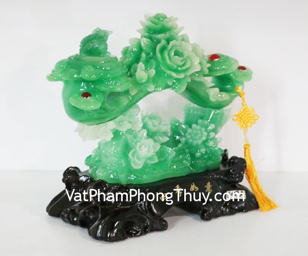 Chất liệu và hoàn thiện: Tượng hoa mẫu đơn xanh nở trên gậy như ý lớn, có cóc ba chân tài lộc, đế gỗ, hàng bột đá màu cao cấp (tại Việt Nam).