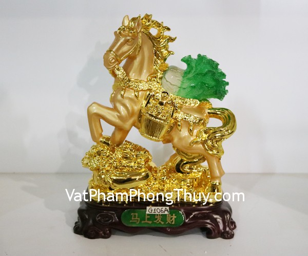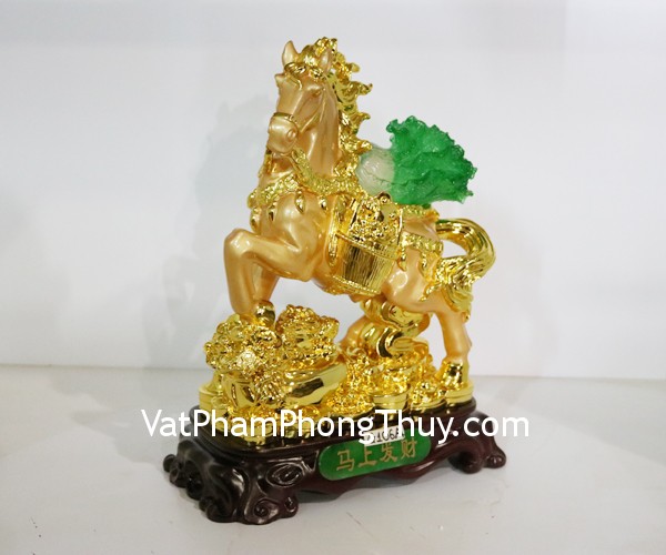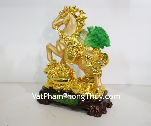 + Chất liệu và hoàn thiện: Tượng ngựa vàng cõng cải xanh, bột đá mạ vàng trên đế gỗ (tại Việt Nam)