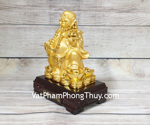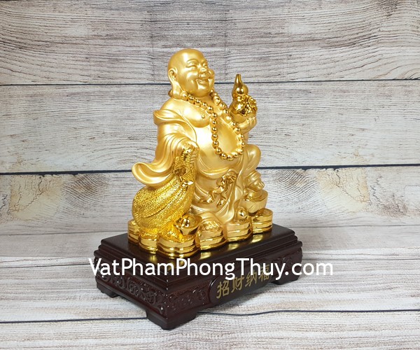 + Chất liệu và hoàn thiện: Phật di lạc vàng cầm hồ lô và túi tiền, hàng bột đá mạ vàng cao cấp (tại Việt Nam).