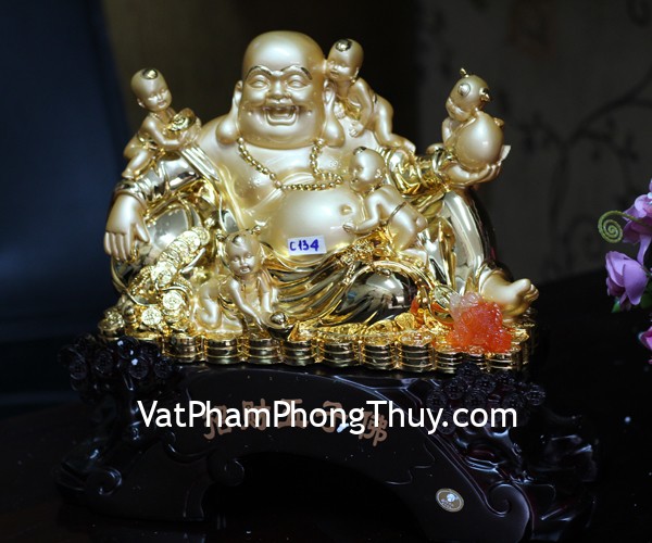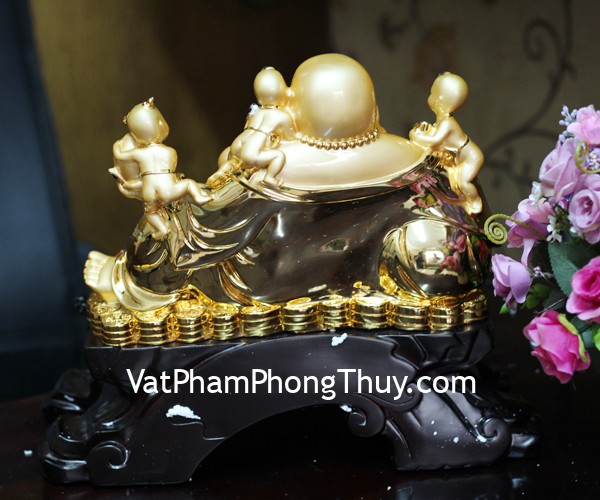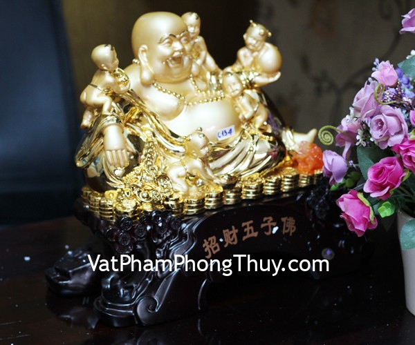 + Chất liệu và hoàn thiện: Phật di lạc vàng ngồi ôm 5 đồng tử, có thiềm thừ giữ tài lộc, hàng bột đá mạ vàng non cao cấp (tại Việt Nam).