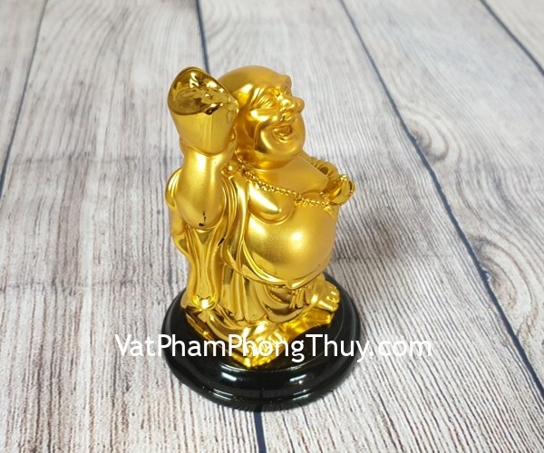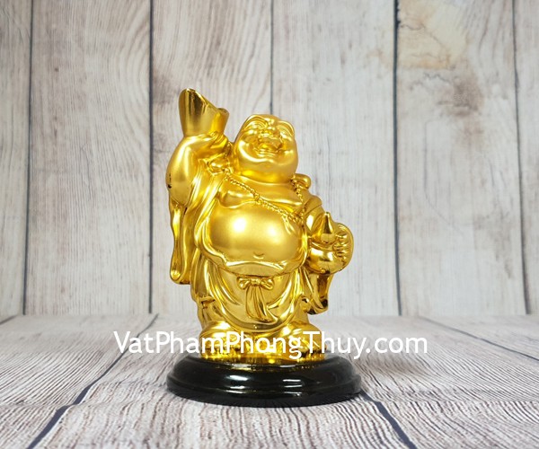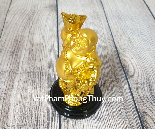 + Chất liệu và hoàn thiện: Phật di lạc vàng tay cầm nén vàng và hồ lô, đứng trên đế gỗ tròn, hàng bột đá cao cấp (tại Việt Nam).