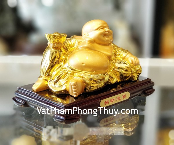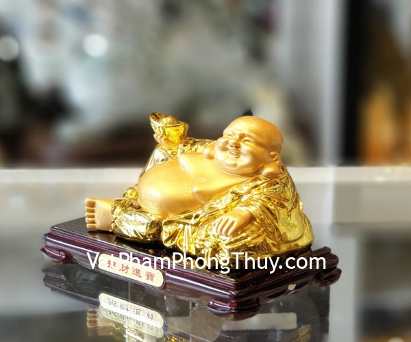 + Chất liệu và hoàn thiện: Phật di lạc tay cầm nén vàng trên đế gỗ túi tài lộc, hàng bột đá mạ vàng cao cấp (tại Việt Nam).