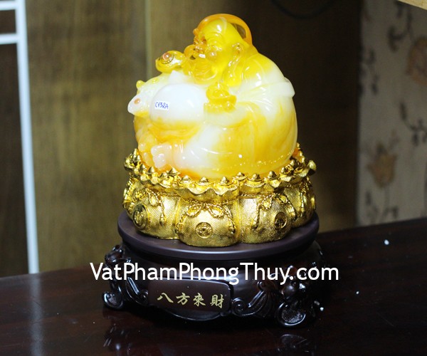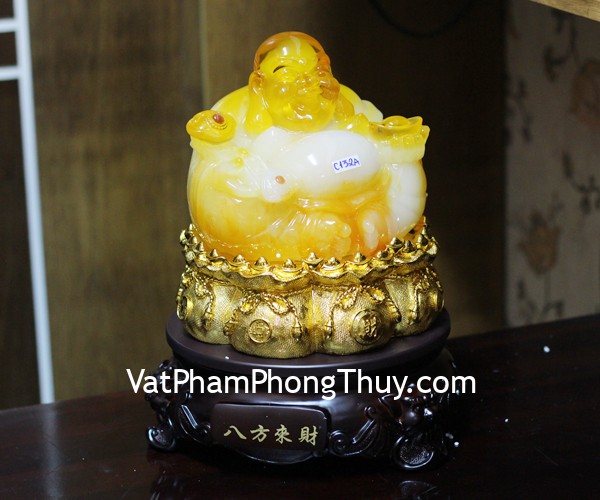 + Chất liệu và hoàn thiện: Phật di lạc vàng cam ngồi trên túi tiền, có đế gỗ xoay, hàng bột đá màu cao cấp (tại Việt Nam).