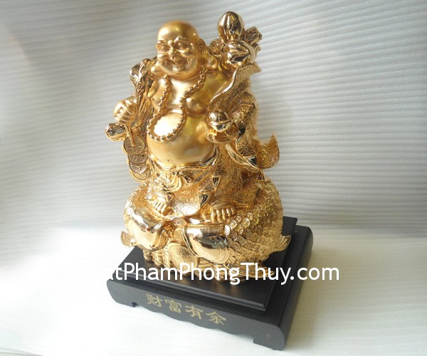 + Chất liệu và hoàn thiện: Phật di lạc ngồi trên cá kim long, bột đá mạ vàng non (tại Việt Nam).