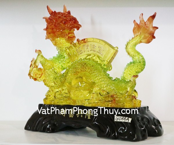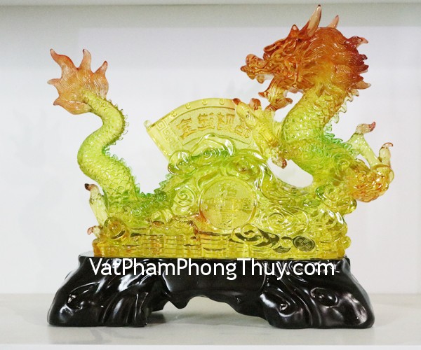 + Chất liệu và hoàn thiện: Tượng rồng lưu ly trên kim nguyên bảo, có đế gỗ, hàng bột đá màu cao cấp (tại Việt Nam).