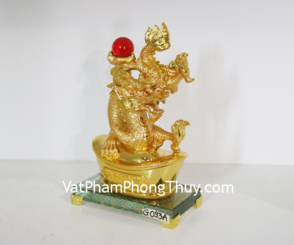 + Chất liệu và hoàn thiện: Tượng rồng màu vàng phun châu ngọc đứng trên kim nguyên bảo, đế thủy tinh, hàng bột đá mạ vàng cao cấp (tại Việt Nam).